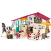 Iepakojuma saturs | 1 x café, 1 x Tom, 1 x Tom’s Pinto stallion, Pino, 1 x Emily, 1 x waiter’s apron, 1 x trellis with roses, 1 x menu board, 1 x advertising board, 1 x golden key, 1 x counter, 1 x cabinet, 1 x oven, 1 x shelf, 1 x coffee machine, 1 x till, 1 x ceiling lamp, 2 x bistro table, 4 x chair, 1 x sunshade, 4 x cup, 4 x plate, 4 x piece of blueberry pie, 4 x piece of apple pie, 4 x cupcake, 2 x cream topping, 3 x bottles of lemonade, 2 x glass with straw, 2 x rosettes, 2 x flower vase, 2 x bouquet of flowers, 1 x tether pole for horses, 1 x manger, 1 x trough, 1 x halter, 2 x apples, 1 x saddle, 1 x bridle and reins, 1 x feeding box, 1 x sticker, 1 x assembly instructions |